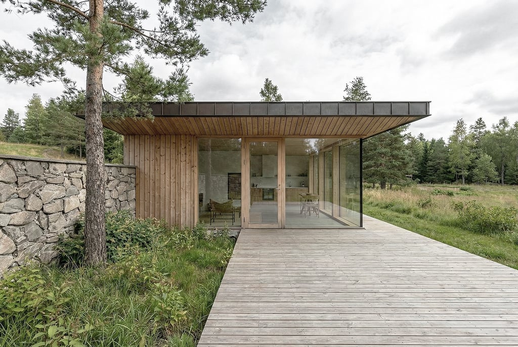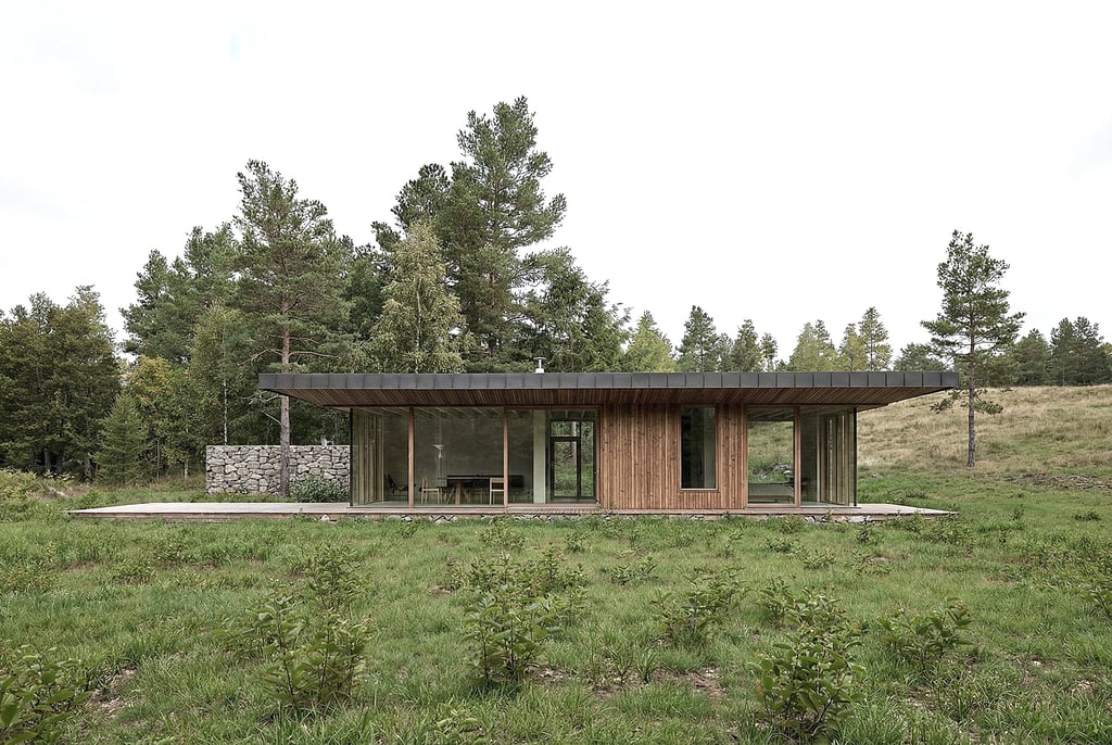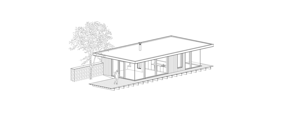 La toiture inclinée à larges débords protège le bâti tout en assurant un ombrage naturel. Ce plan ouvert favorise le cadrage des vues et une immersion totale dans le paysage naturel.
