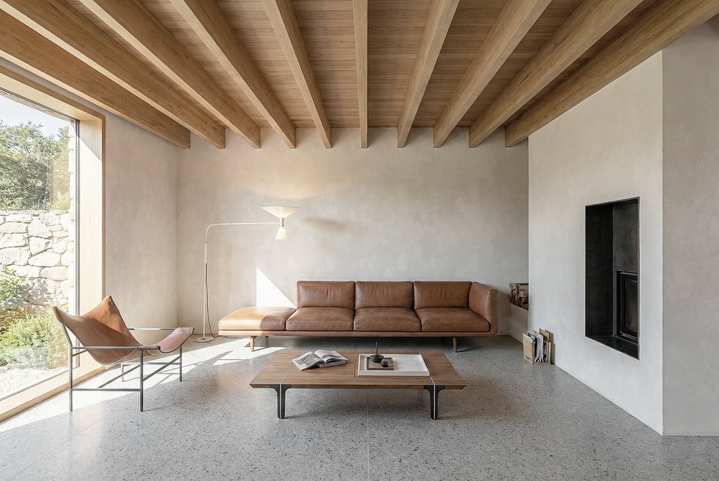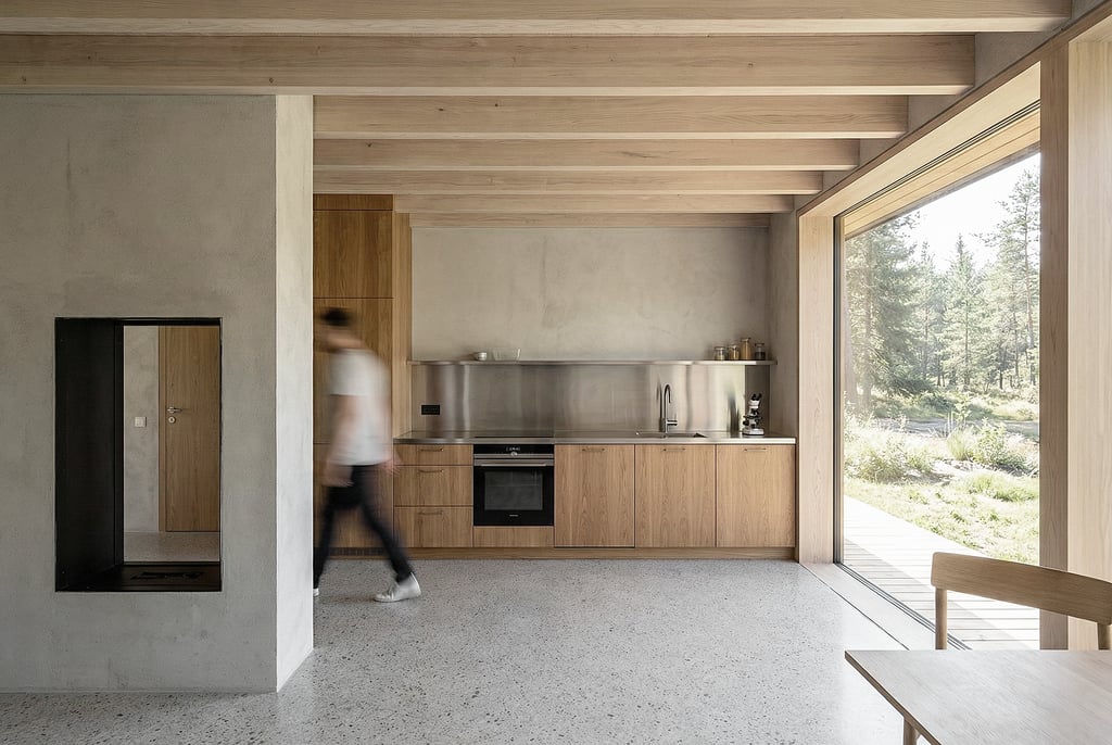 À l'intérieur, le volume se divise en deux espaces distincts. L’espace de jour est d’abord défini par une zone d’entrée prolongée par la cuisine, puis par une ouverture sur le paysage. En contournant le montant central qui accueille la cheminée, on accède au séjour, lequel s’ouvre totalement sur son contexte et sur la terrasse. Cette cheminée centrale articule les trois fonctions au sein d'un volume unique, tout en préservant une traversée physique et visuelle.