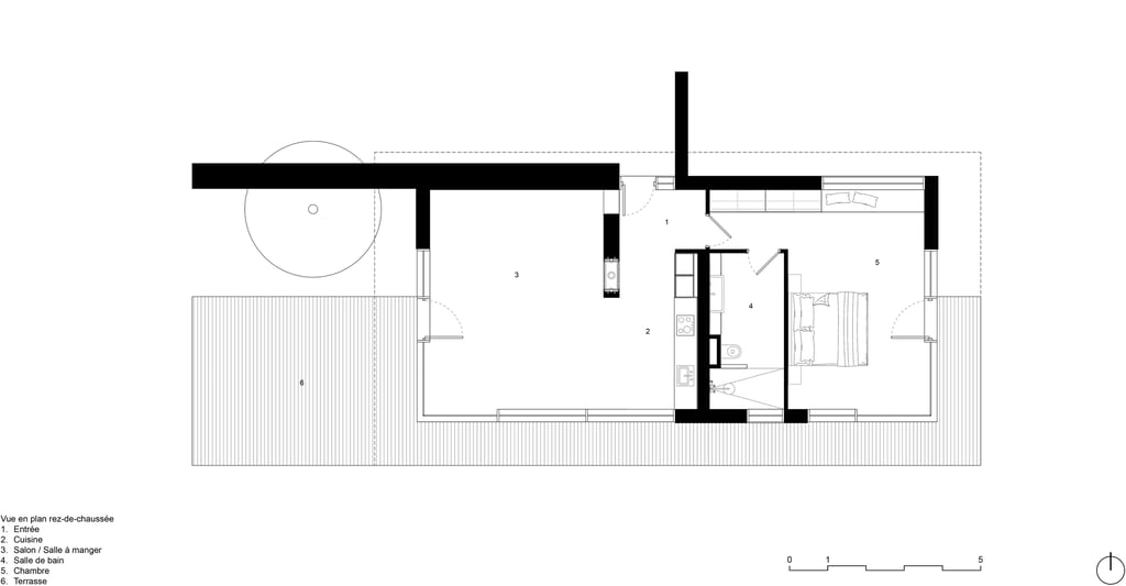 Enfin, suivant la même logique, l’espace de nuit et sa salle de bain se positionnent en symétrie sur l’autre flanc de la maison, également reliés par la terrasse.
